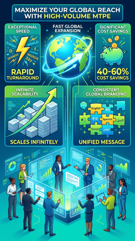 High-volume MTPE is your secret weapon for ramping up translations fast and cheap, thanks to that AI + human magic. Drowning in multilingual stuff? Time to supercharge your efficiency and conquer those global markets.