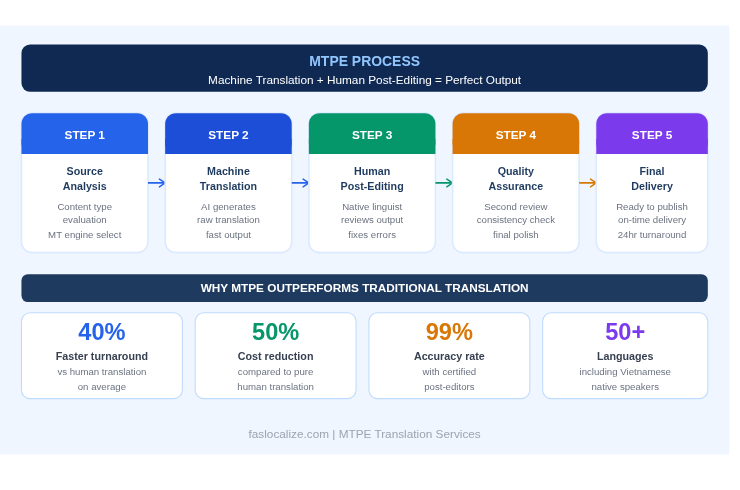 Yes, MTPE is highly effective for Vietnamese translation when conducted by native Vietnamese post-editors. While neural machine translation has improved significantly for Vietnamese, the language’s tonal nature and complex grammar still require expert human post-editing to ensure accuracy and naturalness. At FAS Localize, all our Vietnamese MTPE projects are post-edited by certified native Vietnamese linguists.